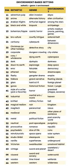 The Grand Table of Settings, a set of D66 prompts to help you create interesting settings: from whole worlds to campaign ideas to adventure prompts.